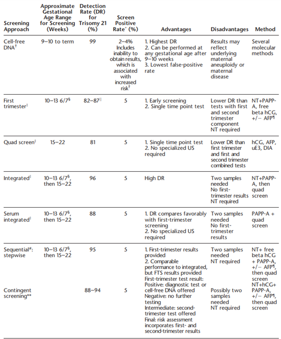 - First (11 – 14 weeks) and second (15 – 22 weeks) trimester contingent screening incorporating maternal serum markers (PAPP-A, hCG with NT); if positive, quad maternal serum markers (hCG, AFP, uE3, DIA with NT).