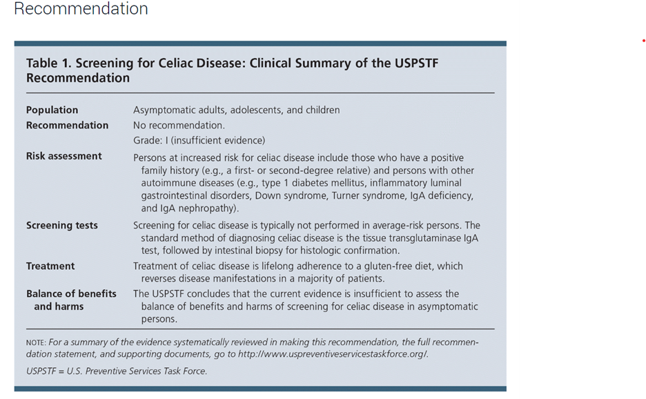 34. Bibbins-Domingo K, Grossman DC, Curry SJ, et al. Screening for Celiac Disease: US Preventive Services Task Force Recommendation Statement. Jama. Mar 28 2017;317(12):1252-1257. doi:10.1001/jama.2017.1462
