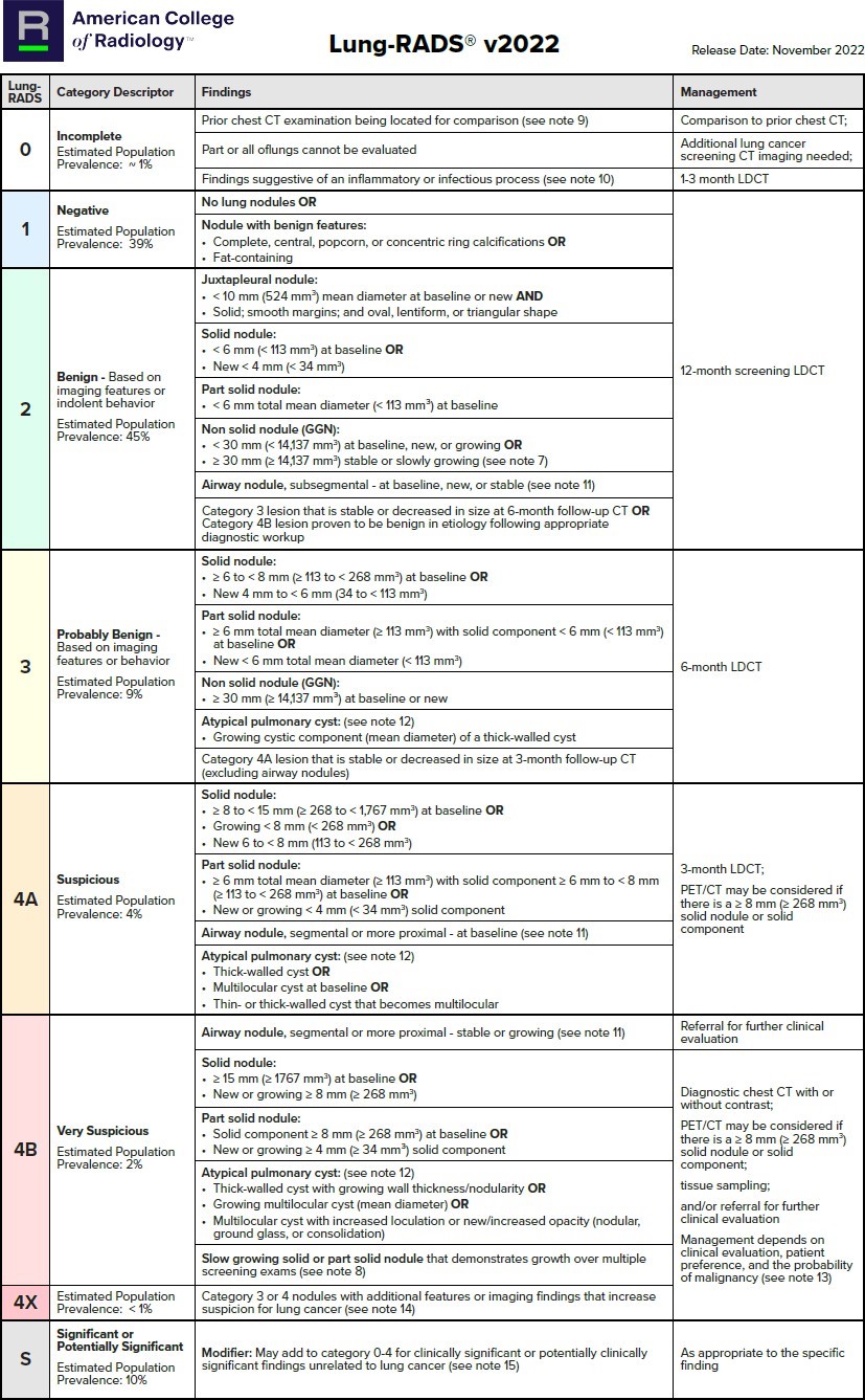 3. Christensen J, Prosper AE, Wu CC, et al. ACR Lung-RADS v2022: Assessment Categories and Management Recommendations. Journal of the American College of Radiology. 2024;21(3):473-488. doi:10.1016/j.jacr.2023.09.009