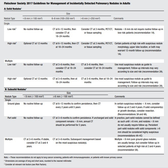 • Follow-up of pulmonary nodules detected on a non-screening (regular) Chest CT is as per Fleischner table (see Table 2) when ALL of the following criteria are met: