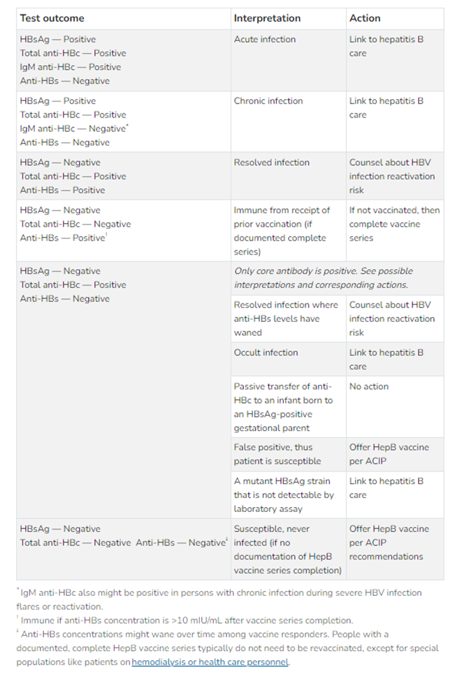- Triple panel testing (HBsAg, anti-HBs, anti-HBc) when one of the following high-risk situations is met: