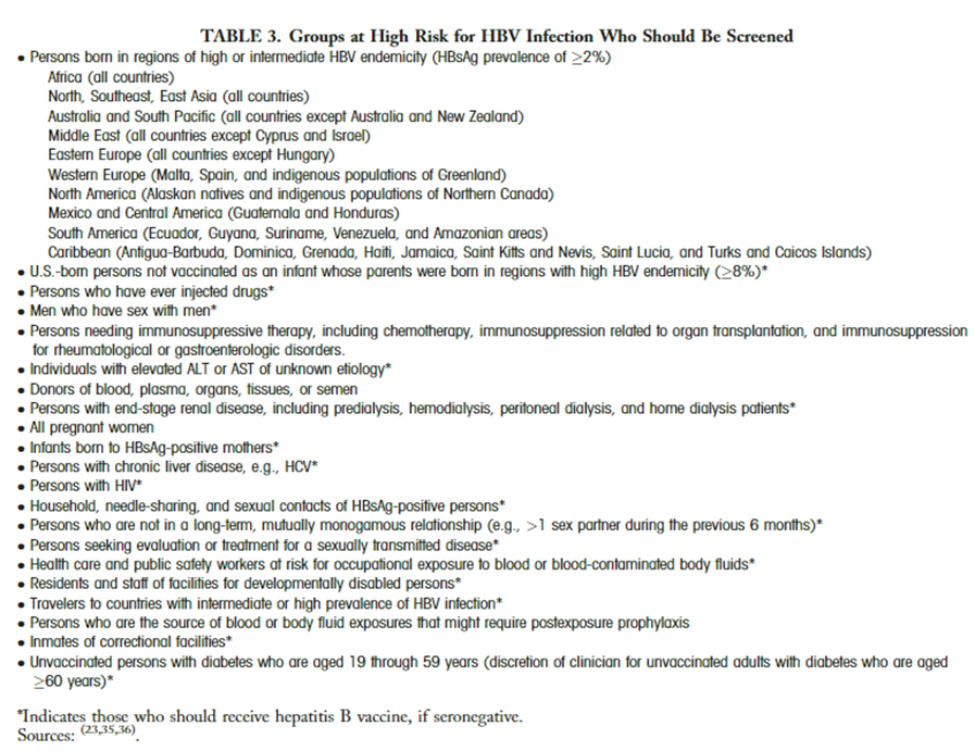 - For individuals born in or who have recently traveled to geographic regions with a HBV prevalence 2% or higher (see Note 1).